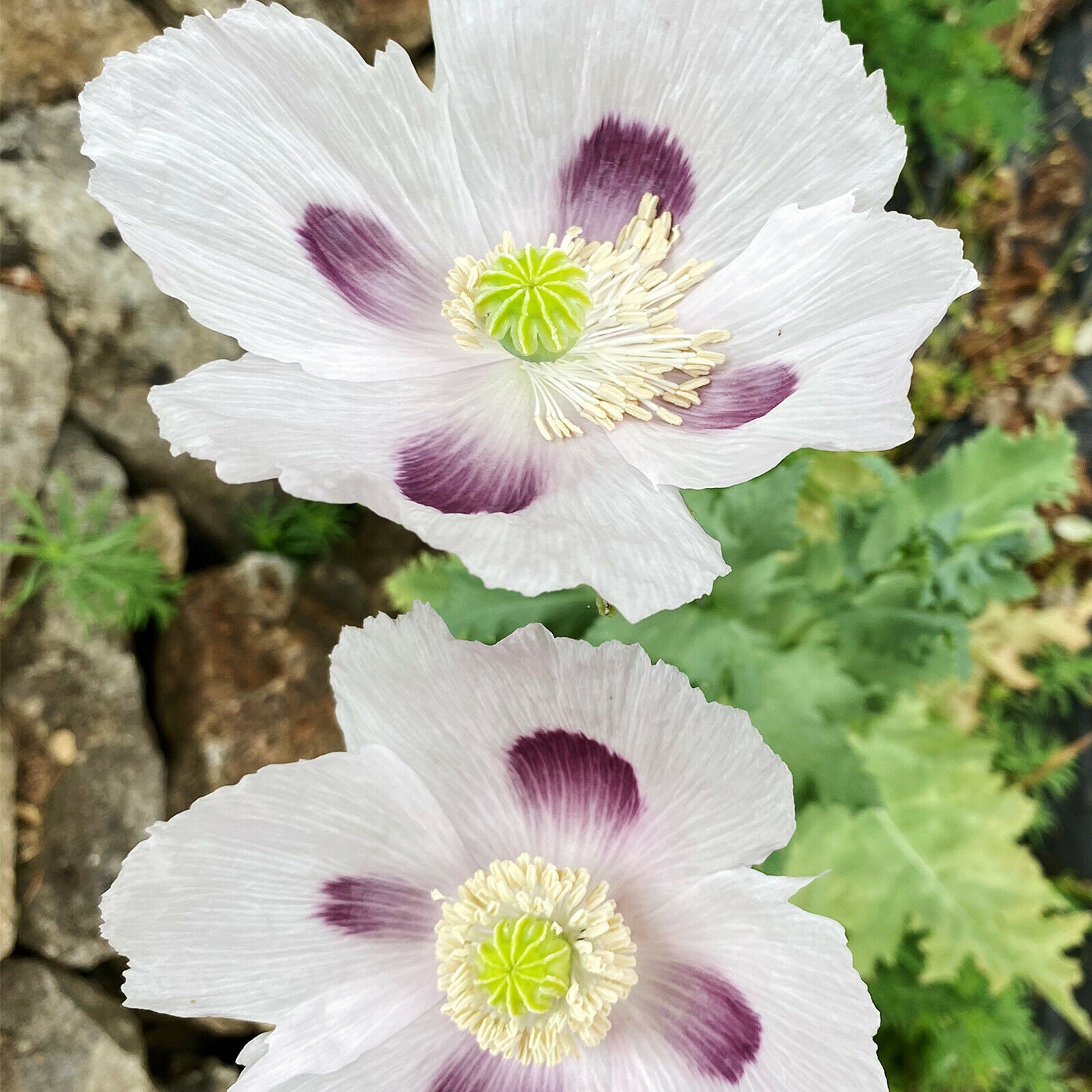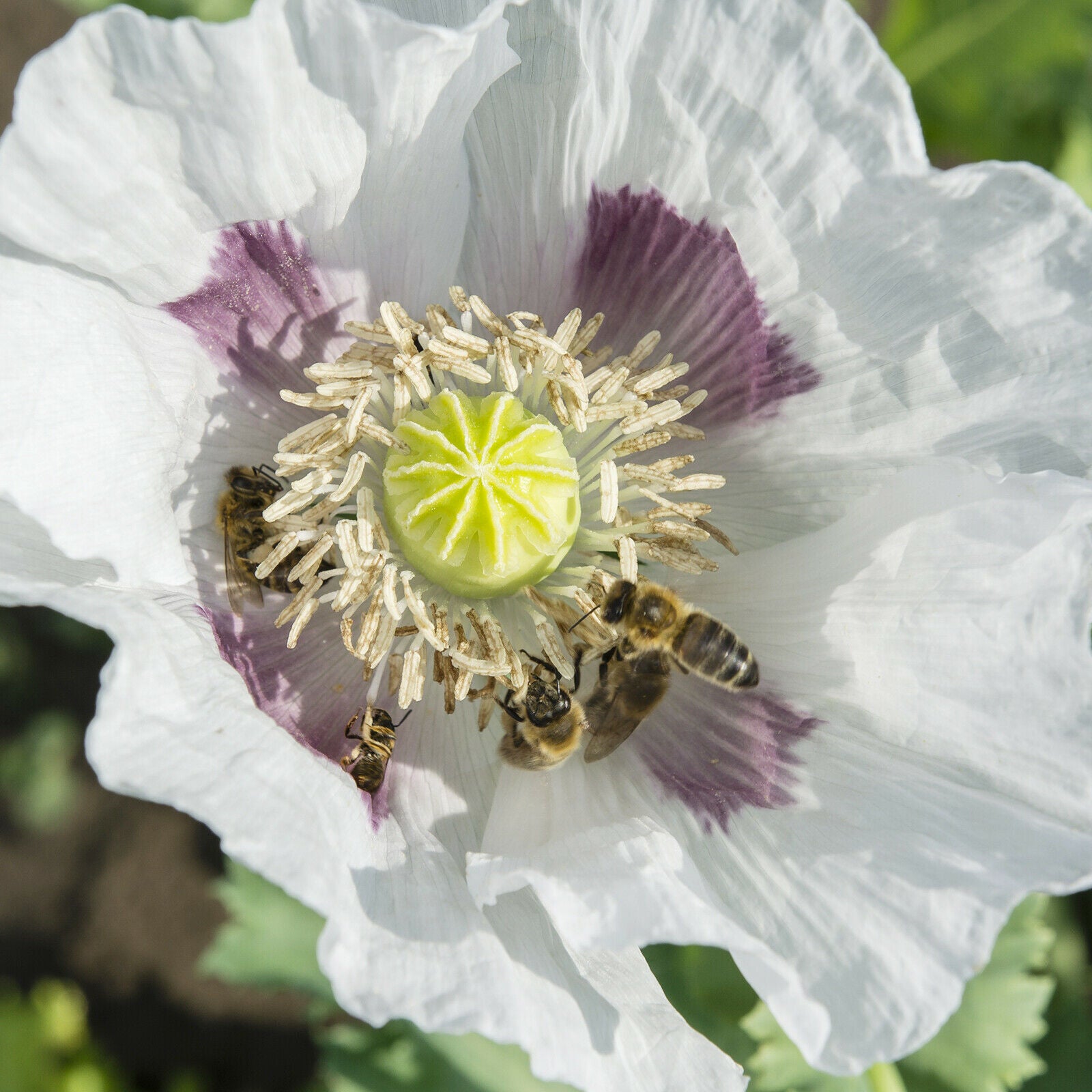 Tasmanian Mohn ist eine außergewöhnliche, seltene Mohnsorte, die mit ihren eleganten weißen Blüten und den markanten violetten Flecken sofort ins Auge fällt. Die seidig schimmernden, großen Blüten öffnen sich weit und wirken fast transparent – ein Anblick, der im Garten eine ruhige, fast magische Atmosphäre erzeugt. Besonders faszinierend ist der kräftig grüne, sternförmige Fruchtknoten, der in großem Kontrast zu den zarten Blütenblättern steht.