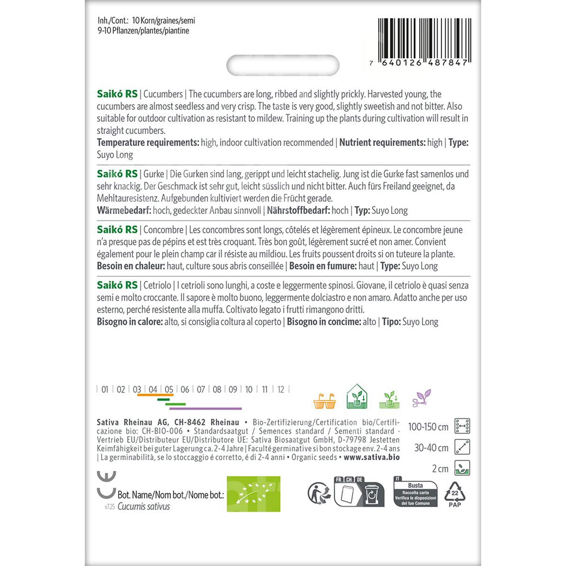 Saikó RS ist eine hochwertige Gurkensorte vom Typ Suyo Long, die sich durch ihre langen, gerippten Früchte mit leicht stacheliger Schale auszeichnet. Besonders im jungen Stadium sind die Gurken nahezu samenlos, sehr knackig und von ausgezeichneter Qualität.