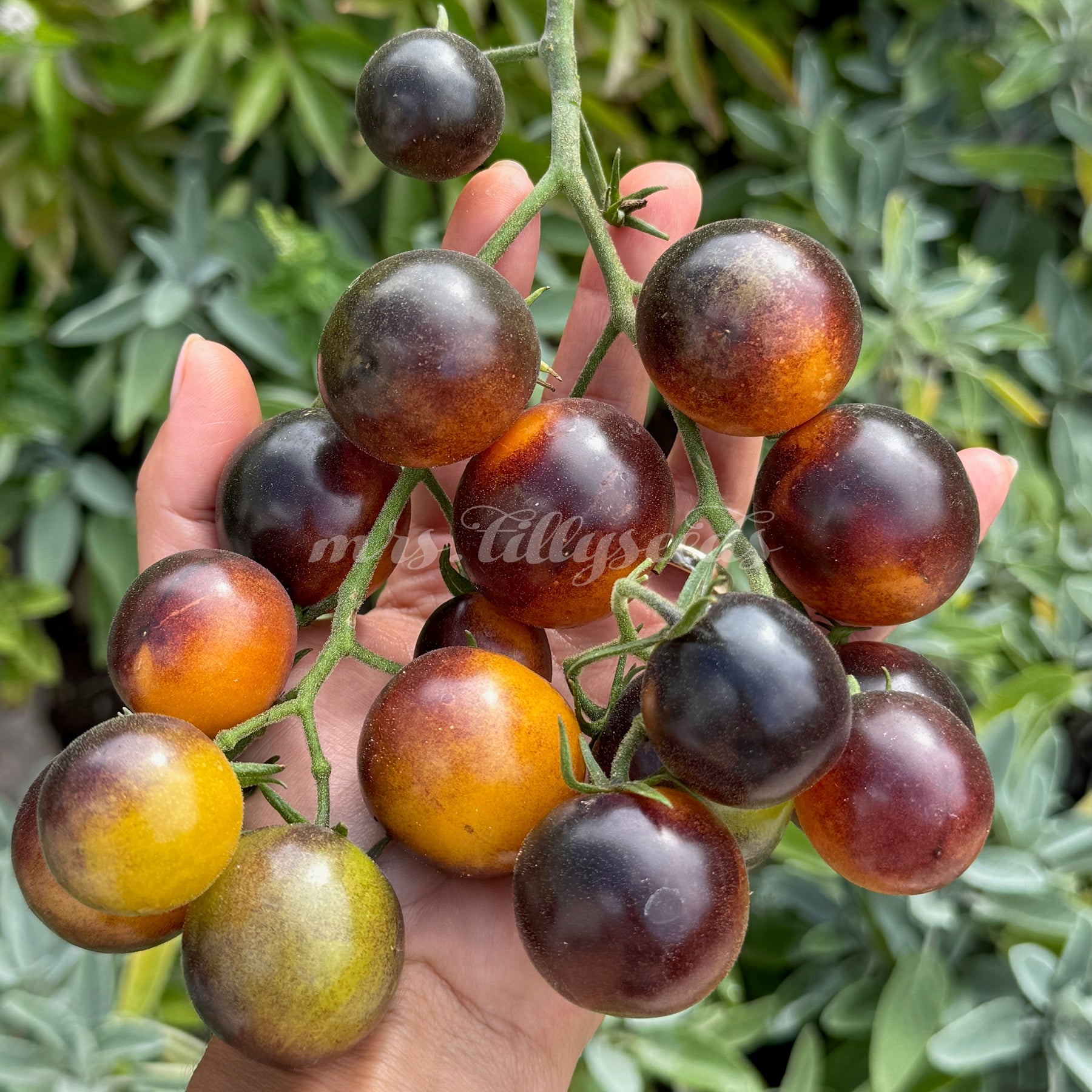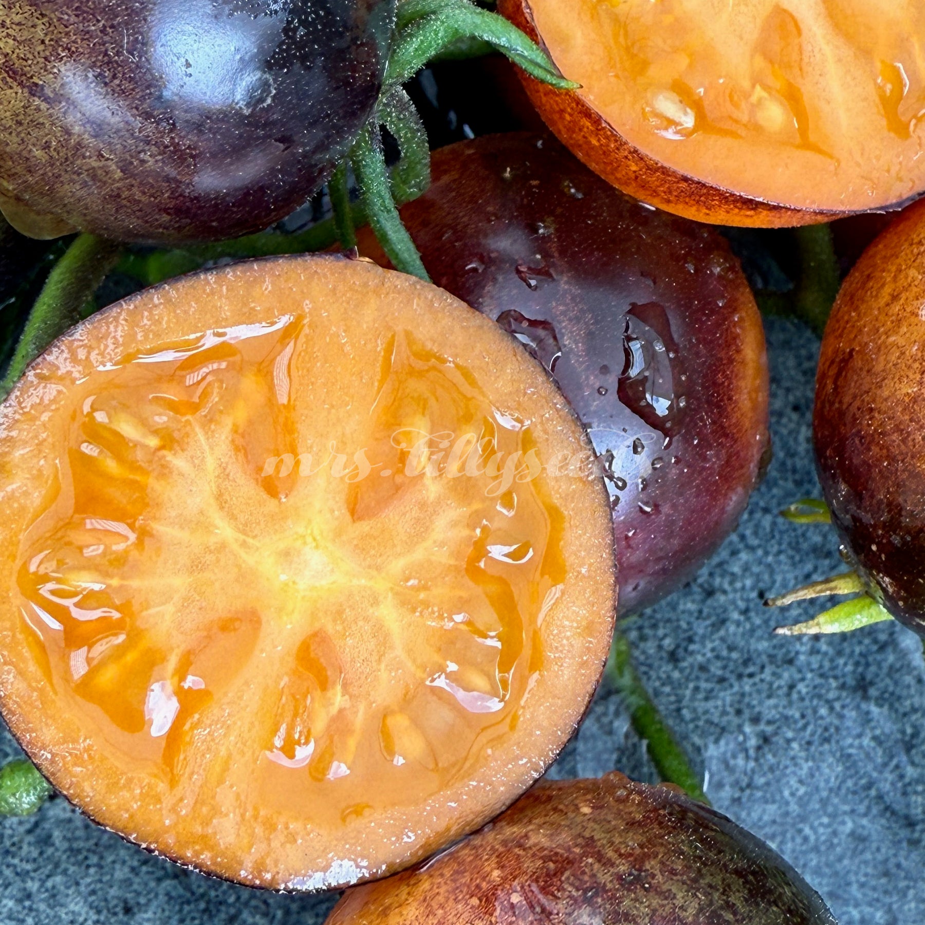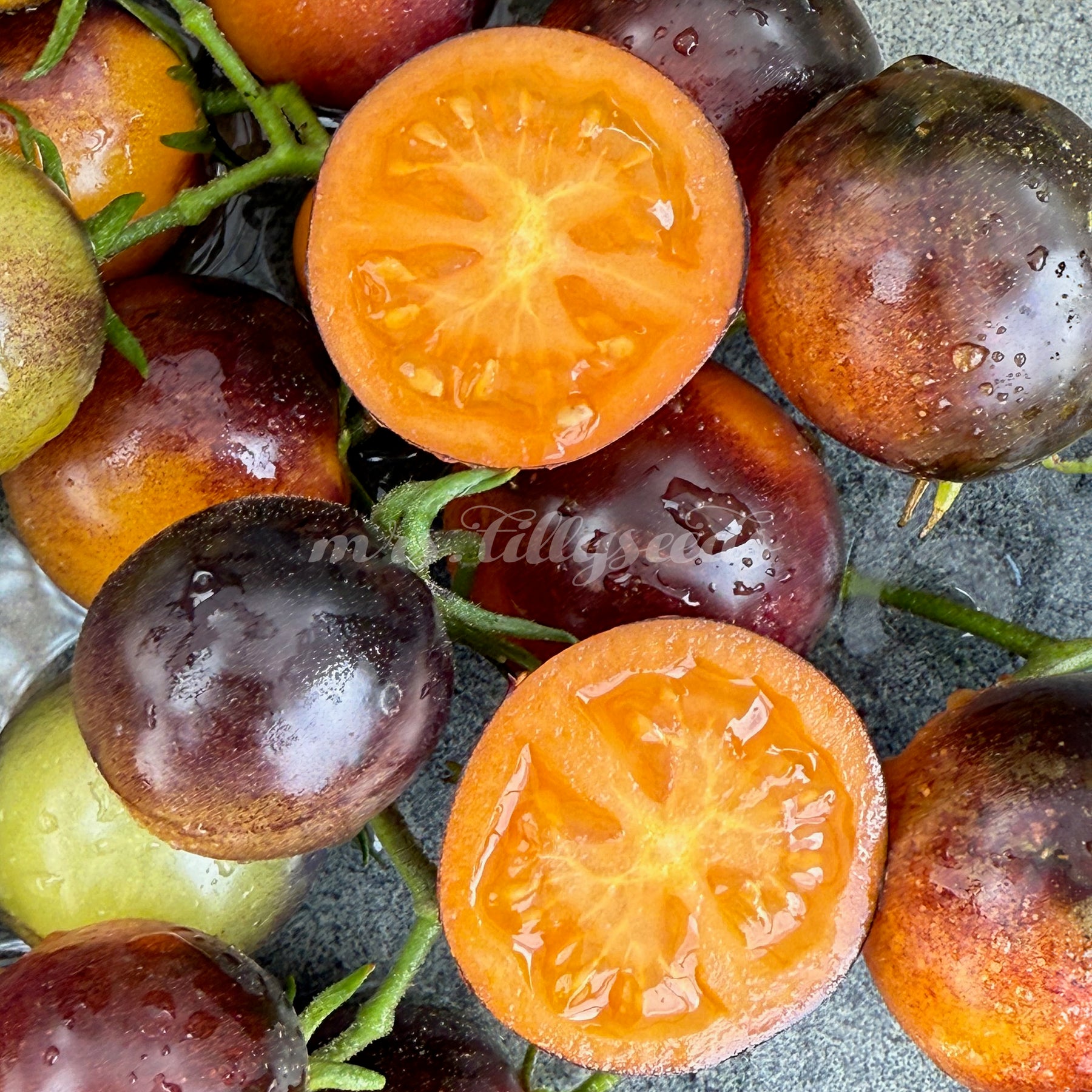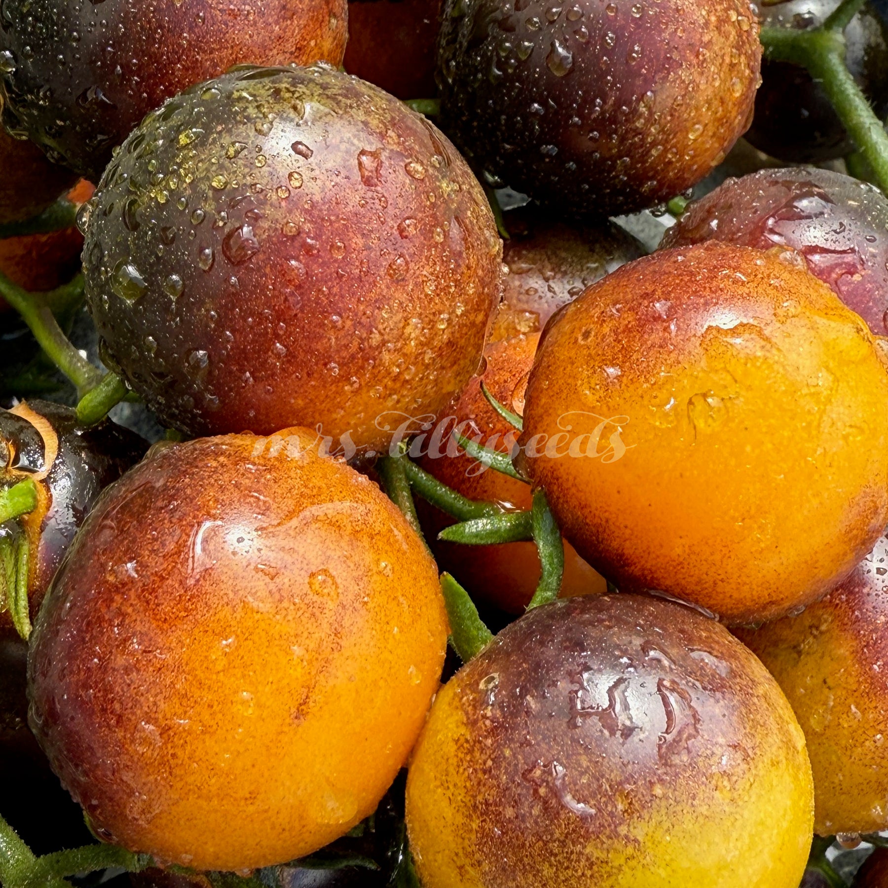 Eine spektakuläre Multiflora Cherrytomate mit Anthocyan-Färbung. Entstanden aus der Züchtungsarbeit von Karen Olivier, vereint diese außergewöhnliche Sorte Schönheit, Ertrag und Robustheit. Supertress Indigo Orange gehört zu den Multiflora-Tomaten – das heißt, sie trägt an ihren Fruchtständen bis zu 30 platzfeste, kleine Tomaten auf einmal. Die Früchte zeigen auf der sonnenzugewandten Seite eine eindrucksvolle bläulich-violette Färbung, die auf einen hohen Gehalt an Anthocyanen zurückzuführen ist – natürliche Antioxidantien, die auch in Blaubeeren enthalten sind.