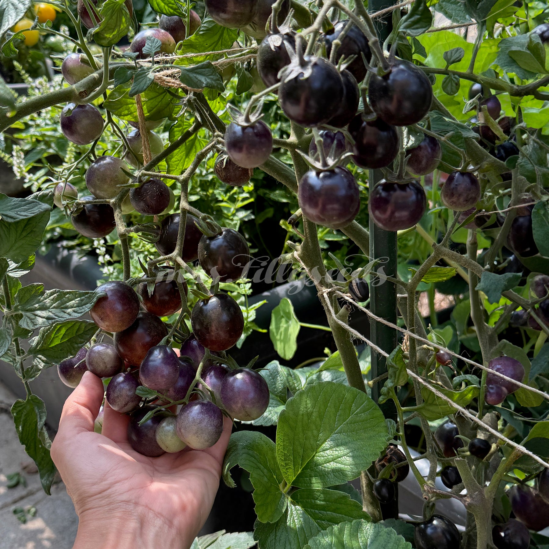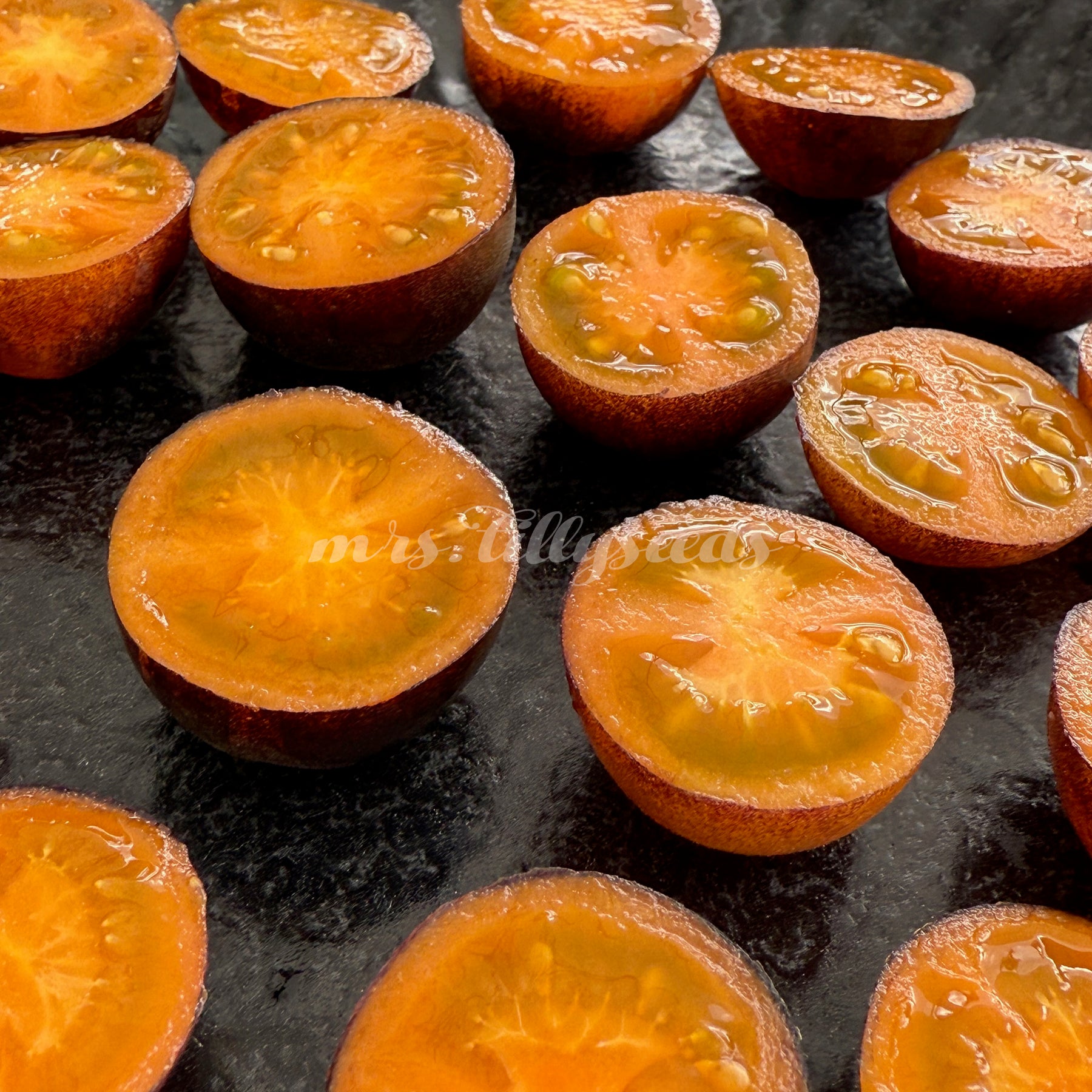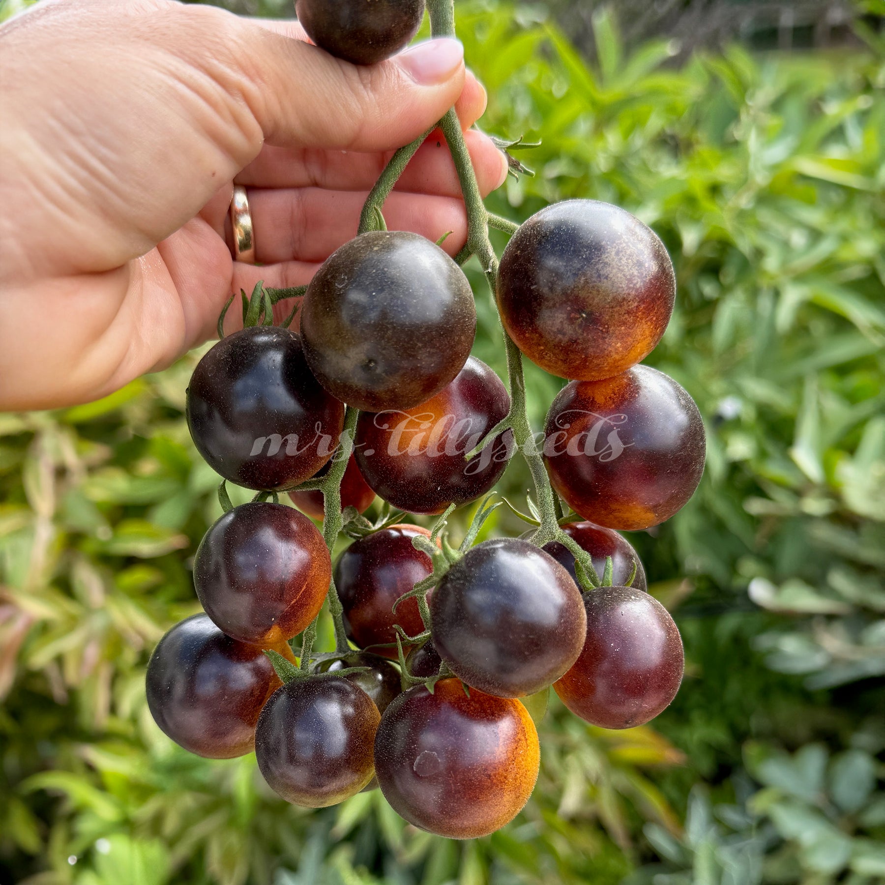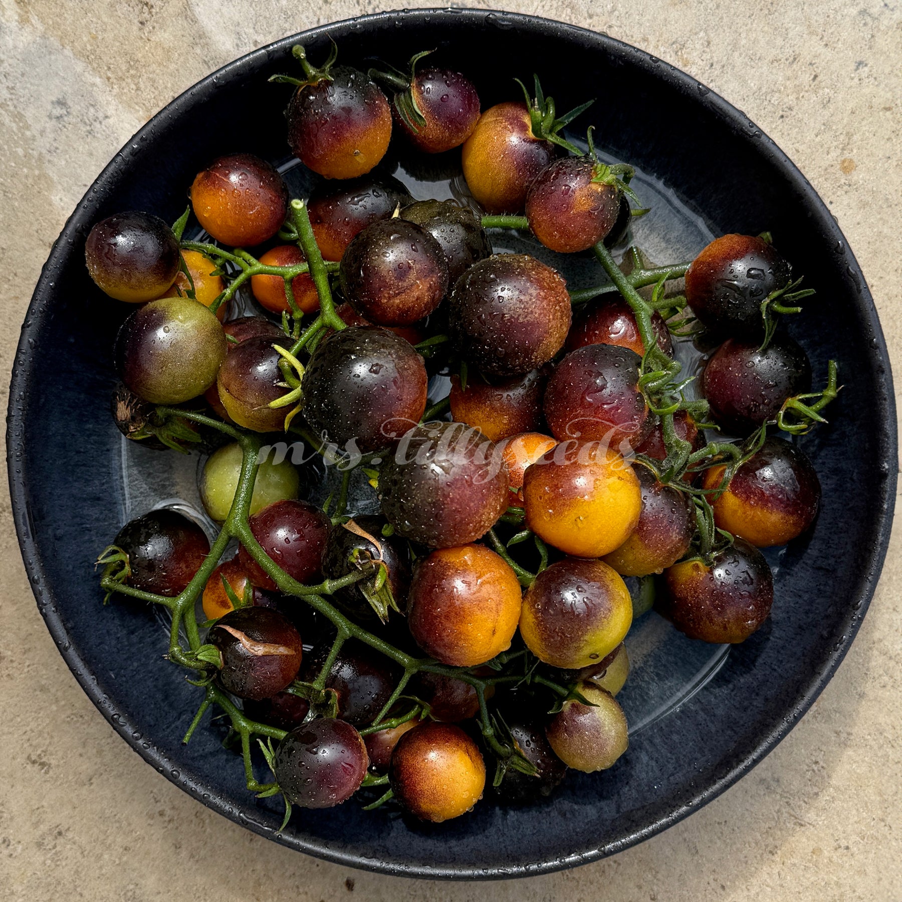 Eine spektakuläre Multiflora Cherrytomate mit Anthocyan-Färbung. Entstanden aus der Züchtungsarbeit von Karen Olivier, vereint diese außergewöhnliche Sorte Schönheit, Ertrag und Robustheit. Supertress Indigo Orange gehört zu den Multiflora-Tomaten – das heißt, sie trägt an ihren Fruchtständen bis zu 30 platzfeste, kleine Tomaten auf einmal. Die Früchte zeigen auf der sonnenzugewandten Seite eine eindrucksvolle bläulich-violette Färbung, die auf einen hohen Gehalt an Anthocyanen zurückzuführen ist – natürliche Antioxidantien, die auch in Blaubeeren enthalten sind.