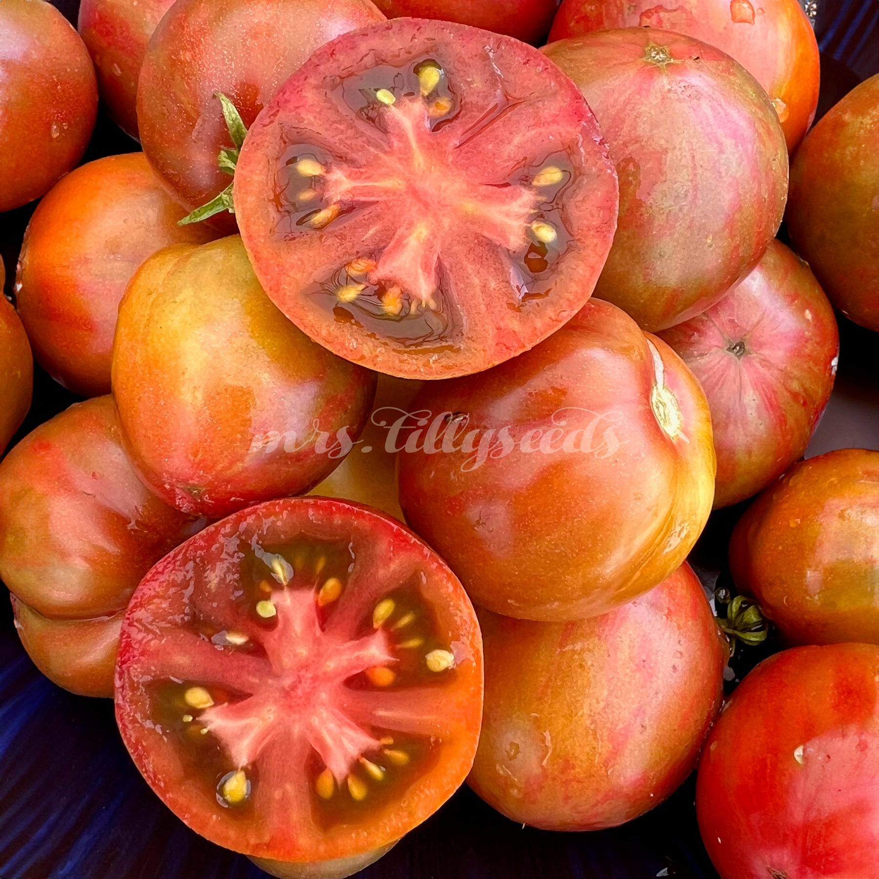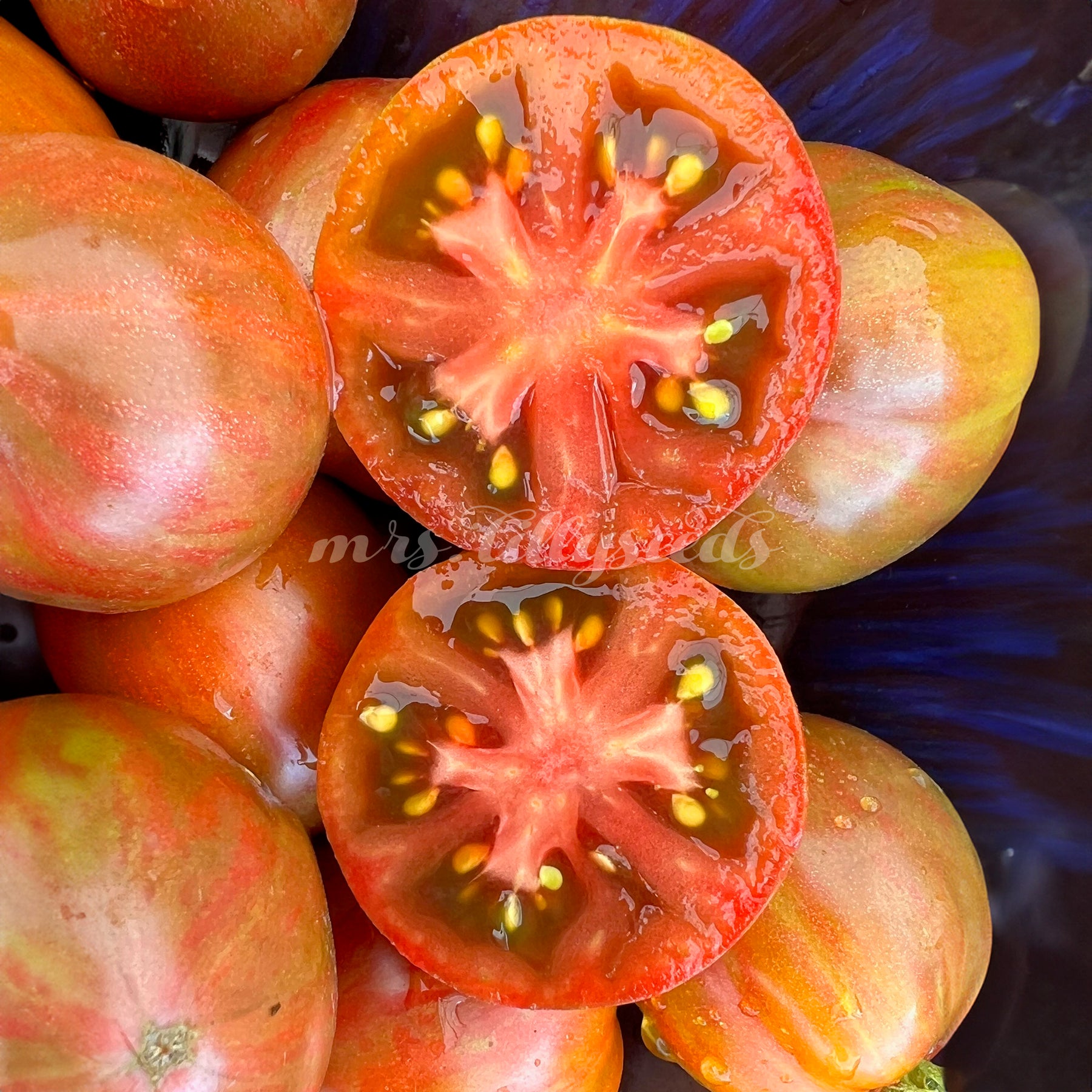 Die Pflanzen sind bei mir im Anbau deutlich höher geworden, als es der Name „Big Mini Dwarf“ vermuten lässt – gute 70 bis 80 cm in Töpfen. Dennoch bleiben sie kompakt im Wuchs und sind hervorragend für Terrassen, Hochbeete und Kübel geeignet. Der gedrungene Wuchs mit kräftigem, rugosem Laub und kurzer Internodienlänge bleibt erhalten. Das besondere Highlight dieser Sorte sind die wunderschönen mittelgroßen Fleischtomaten in intensiven rosa-rot Tönen mit goldgelber Marmorierung. Jede Frucht wirkt wie handgemalt – einzigartig und spektakulär.