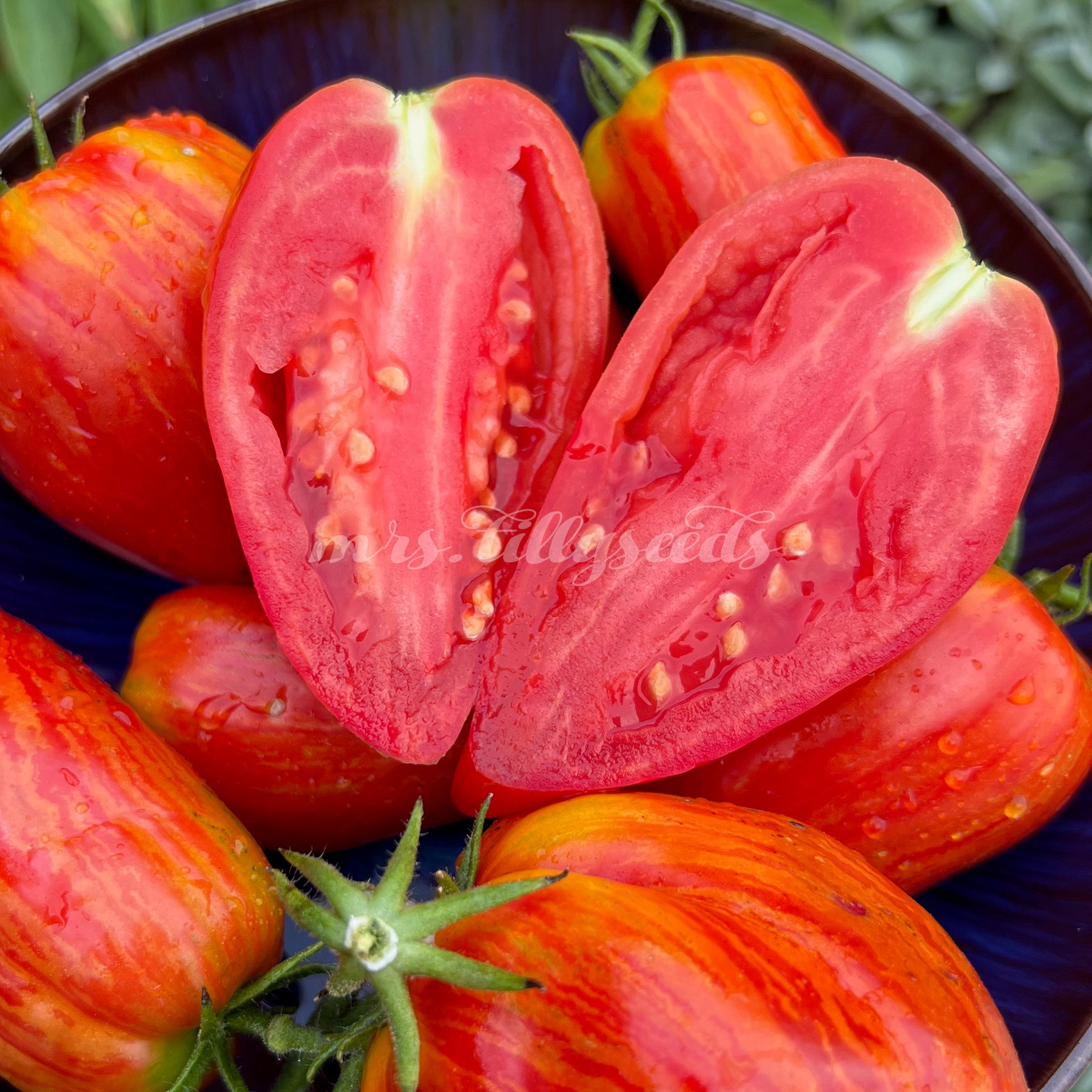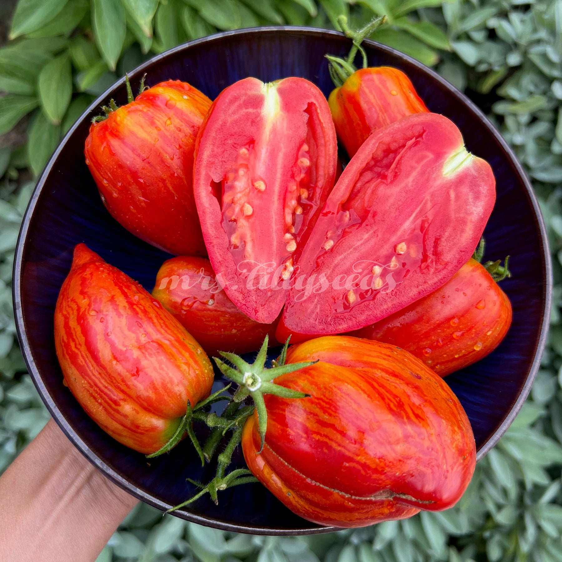 Die Sorte Dwarf Stony Brook Speckled ist nicht einfach nur eine kompakte Tomate – sie ist ein echtes Gestaltungselement für Beete, Hochbeete und Pflanzkübel. Ihre Früchte reifen in einem auffälligen Scharlachrot mit leuchtend goldgelben, gezackten Streifen, oft in länglicher bis pflaumenartiger Form mit spitzem Ende. Jede Frucht wirkt wie gemalt – und das auf Pflanzen, die selbst ohne Fruchtansatz schon dekorativ genug wären, um Aufmerksamkeit zu erzeugen.
