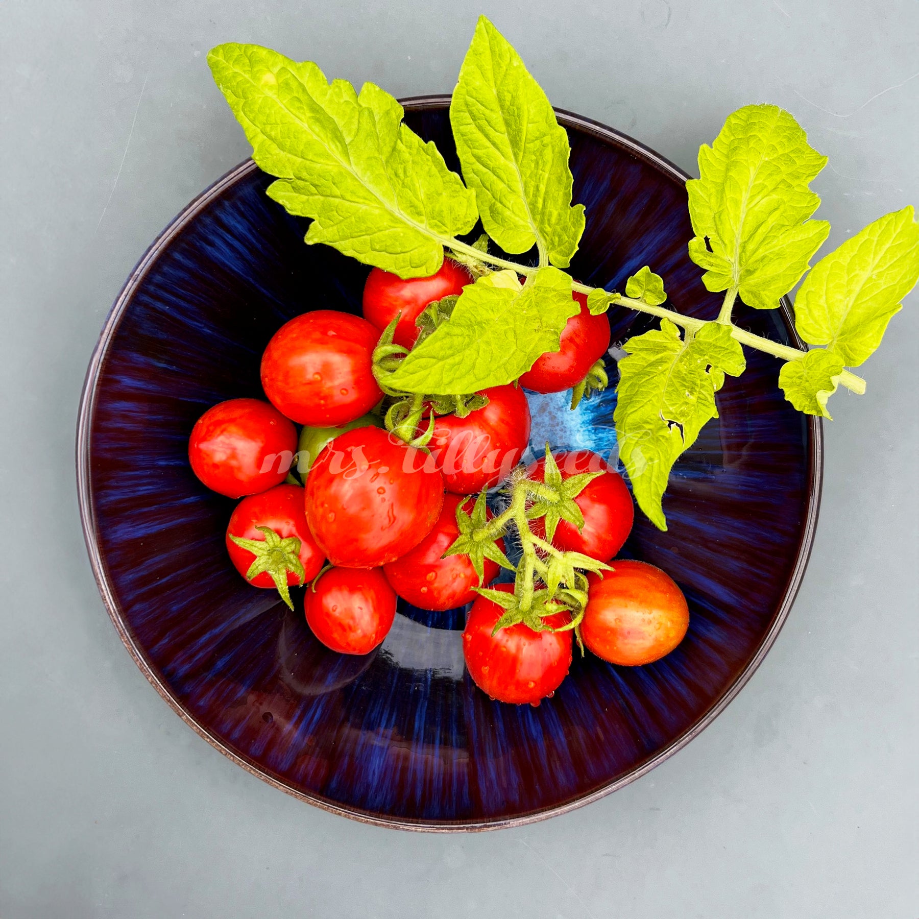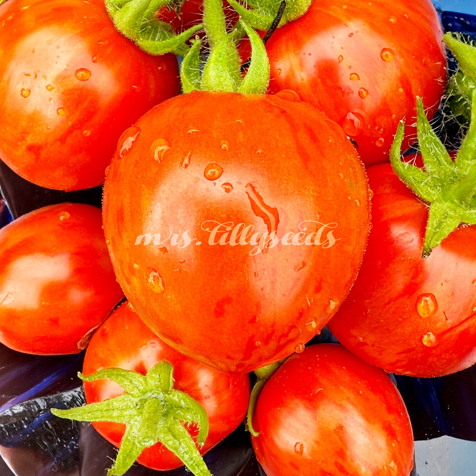 Dwarf Tigerette Red ist eine Sorte, die sofort ins Auge fällt – mit ihrer intensiven, leuchtend roten Farbe und den feinen goldgelben Streifen wirkt jede Frucht wie ein kleines Kunstwerk. Die Form ist meist rund bis leicht oval, mit glatter, glänzender Haut und einer sehr festen, fleischigen Konsistenz. Kaum Saft, wenig Samen – dafür kompakte Substanz und eine hervorragende Struktur.