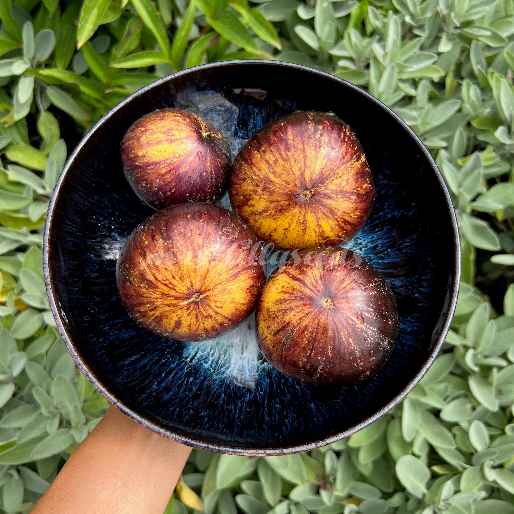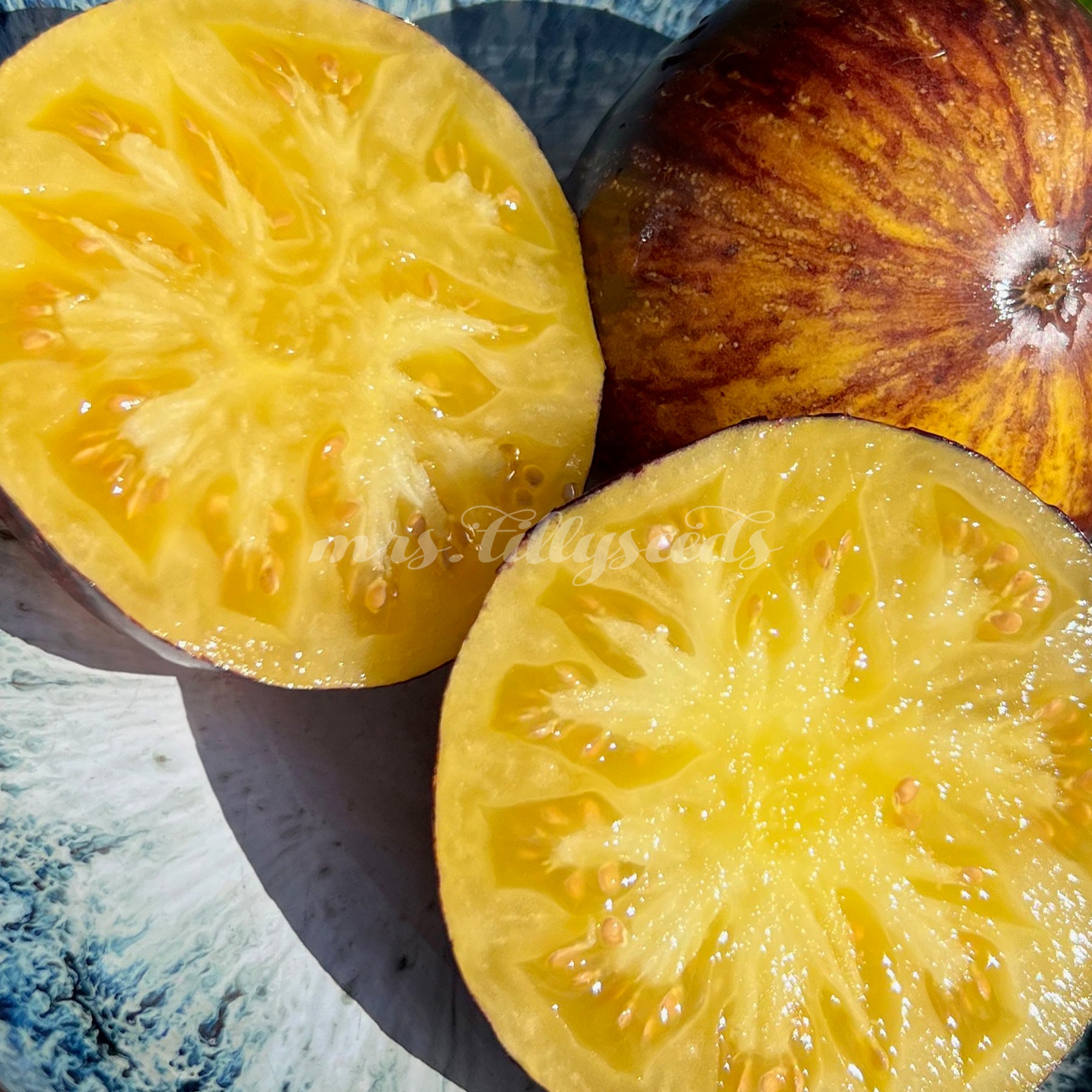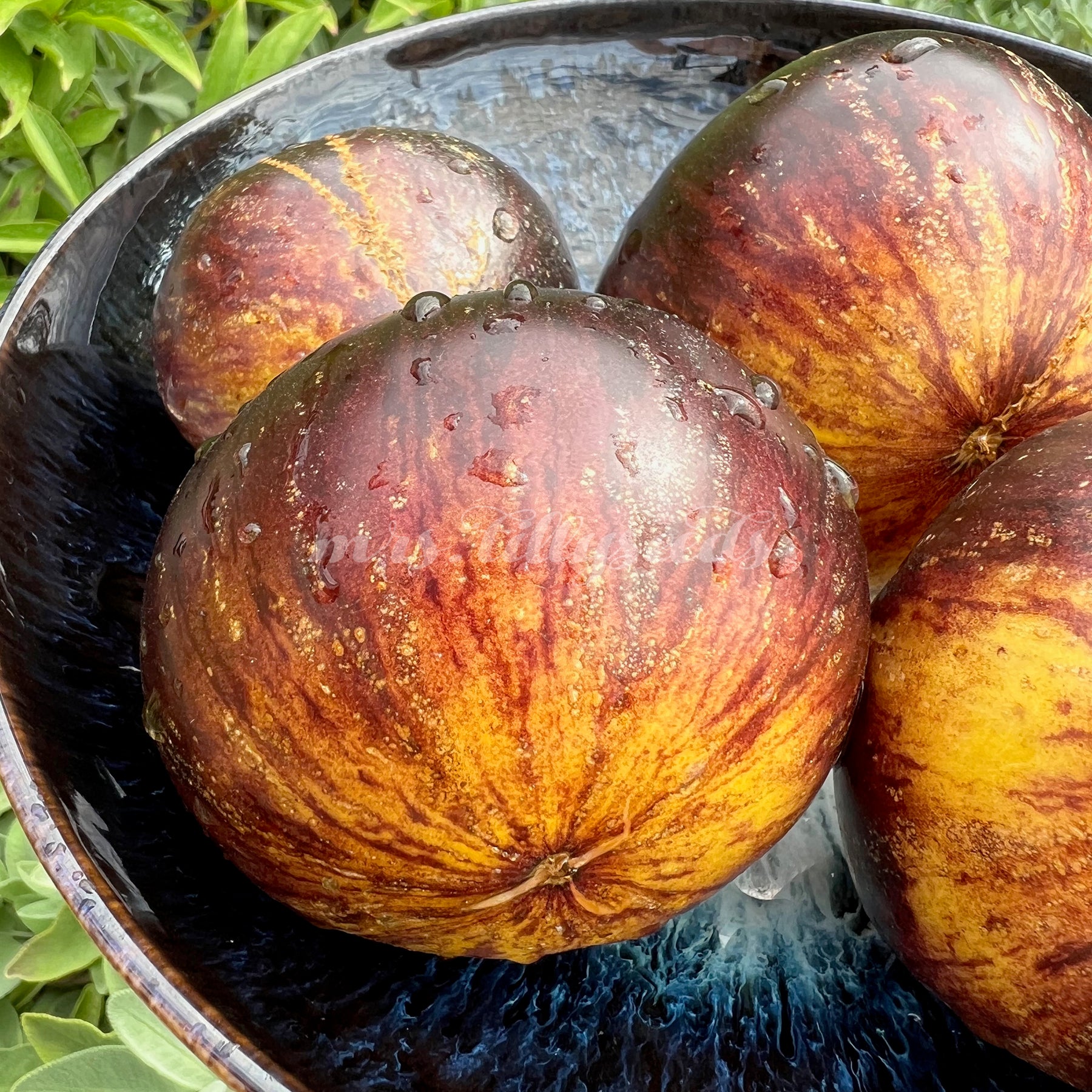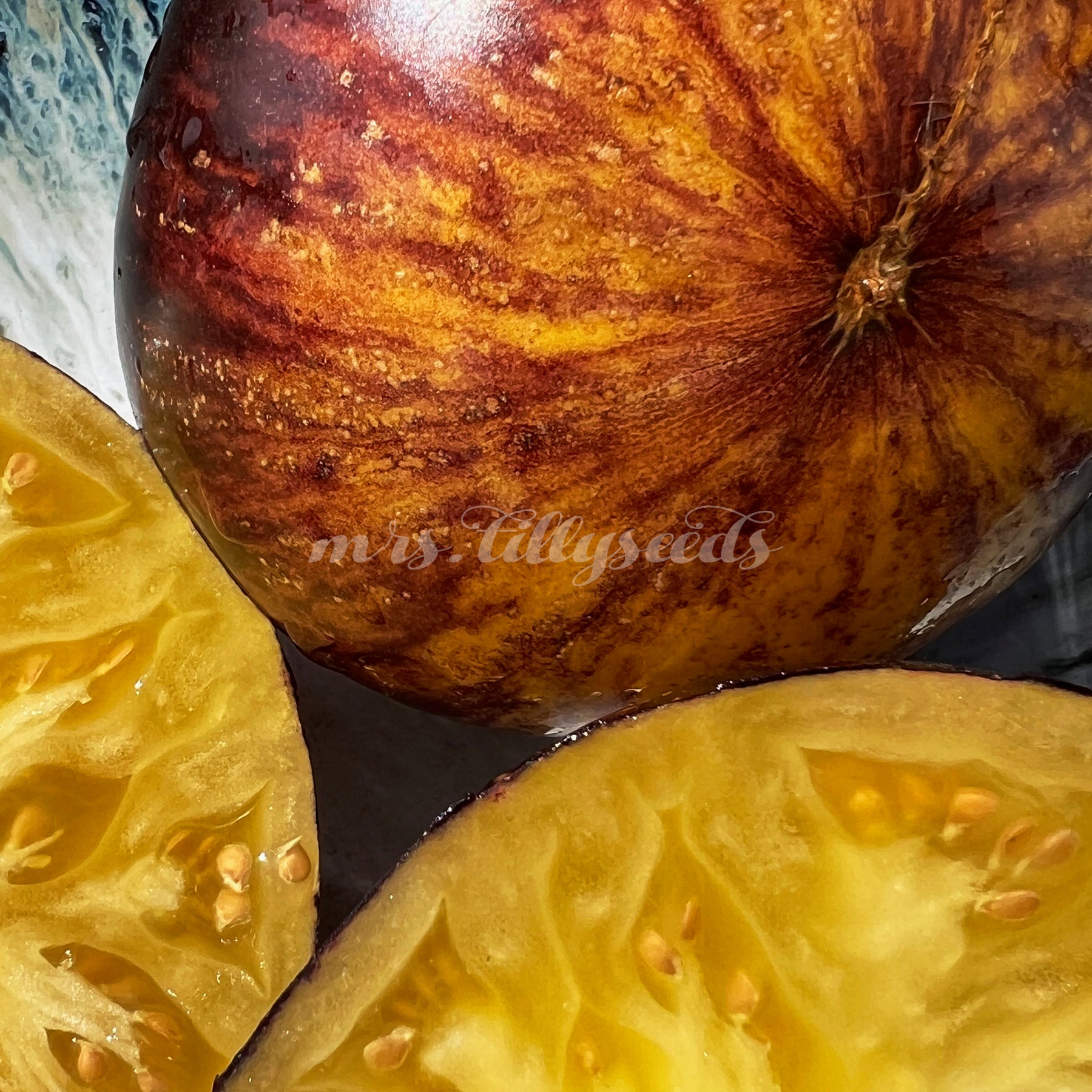 Die runden bis leicht abgeflachten Früchte begeistern durch ihr visuelles Spiel aus dunkelvioletten bis schwarzrotenSchultern und einer warm gold-gelb gestreiften Basis. Im Inneren erwartet dich ein leuchtend gelbes Fruchtfleisch, das sowohl optisch als auch geschmacklich überzeugt: süßlich-fruchtig, saftig, aromatisch – ein echter Genuss direkt vom Strauch.