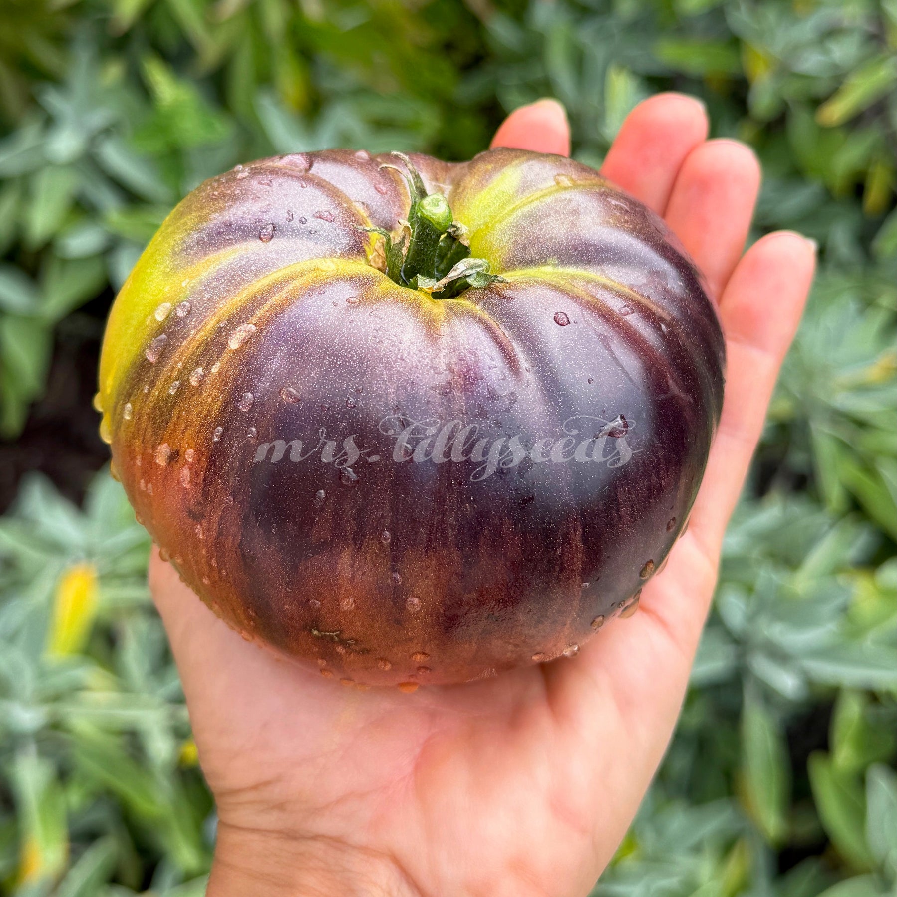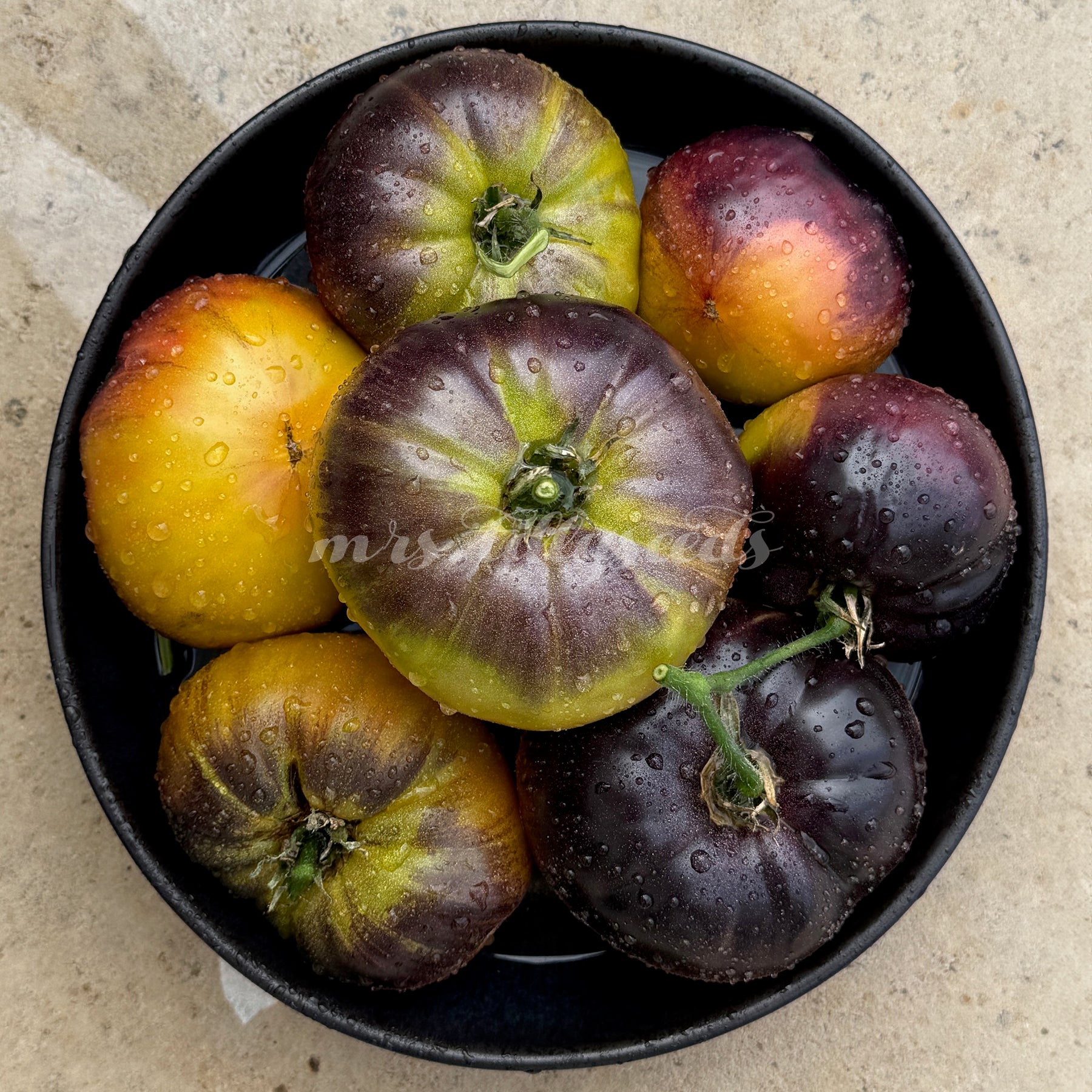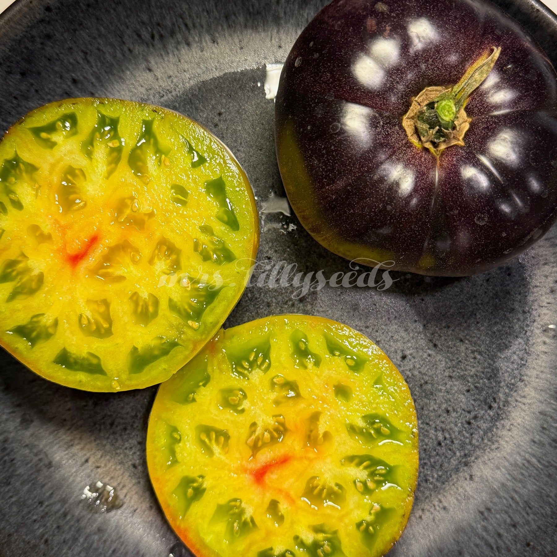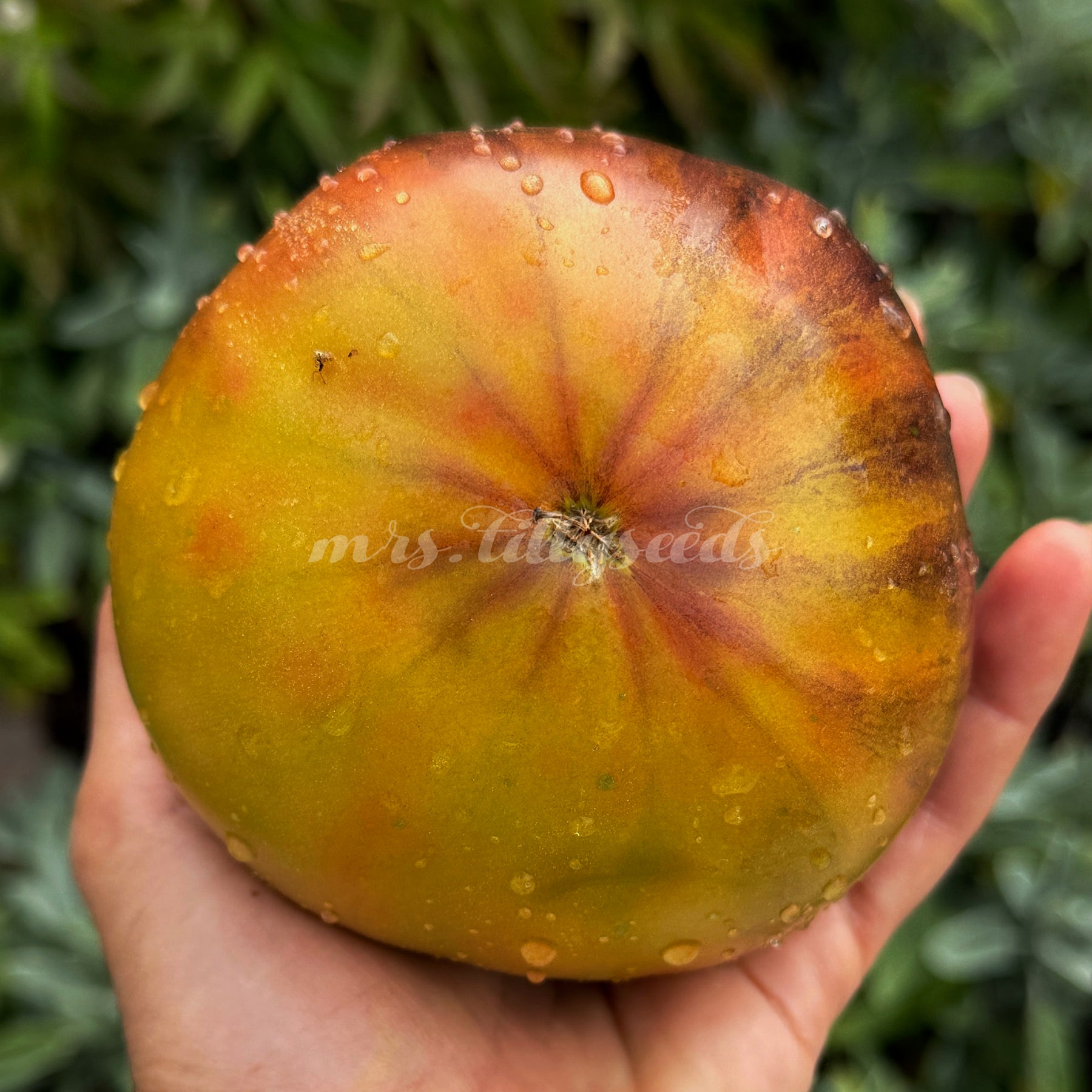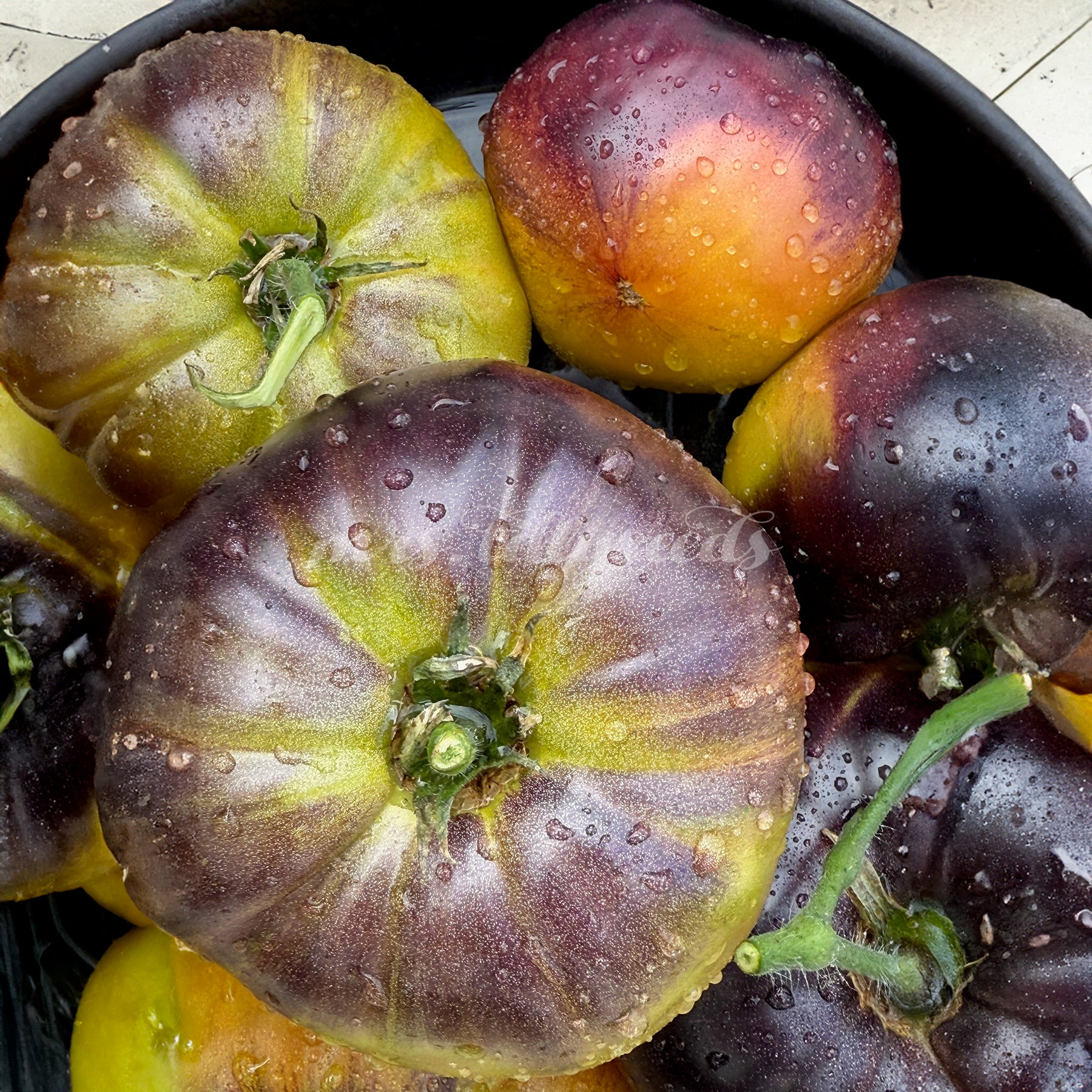 Die Früchte zählen zu den schönsten innerhalb der Fleischtomaten: flachrund, groß, 200–500 g schwer und mit einem Farbspektrum, das von grün-gelb über gold-karamell bis hin zu tiefrosa und fast schwarz reicht. Besonders die dunklen anthocyanfarbenen Schultern verleihen jeder Frucht einen dramatischen Look. Beim Anschnitt zeigt sich ein saftiges, leuchtendes Fruchtfleisch mit intensiv süßem Aroma und ausgewogener, fast tropischer Fruchtigkeit.