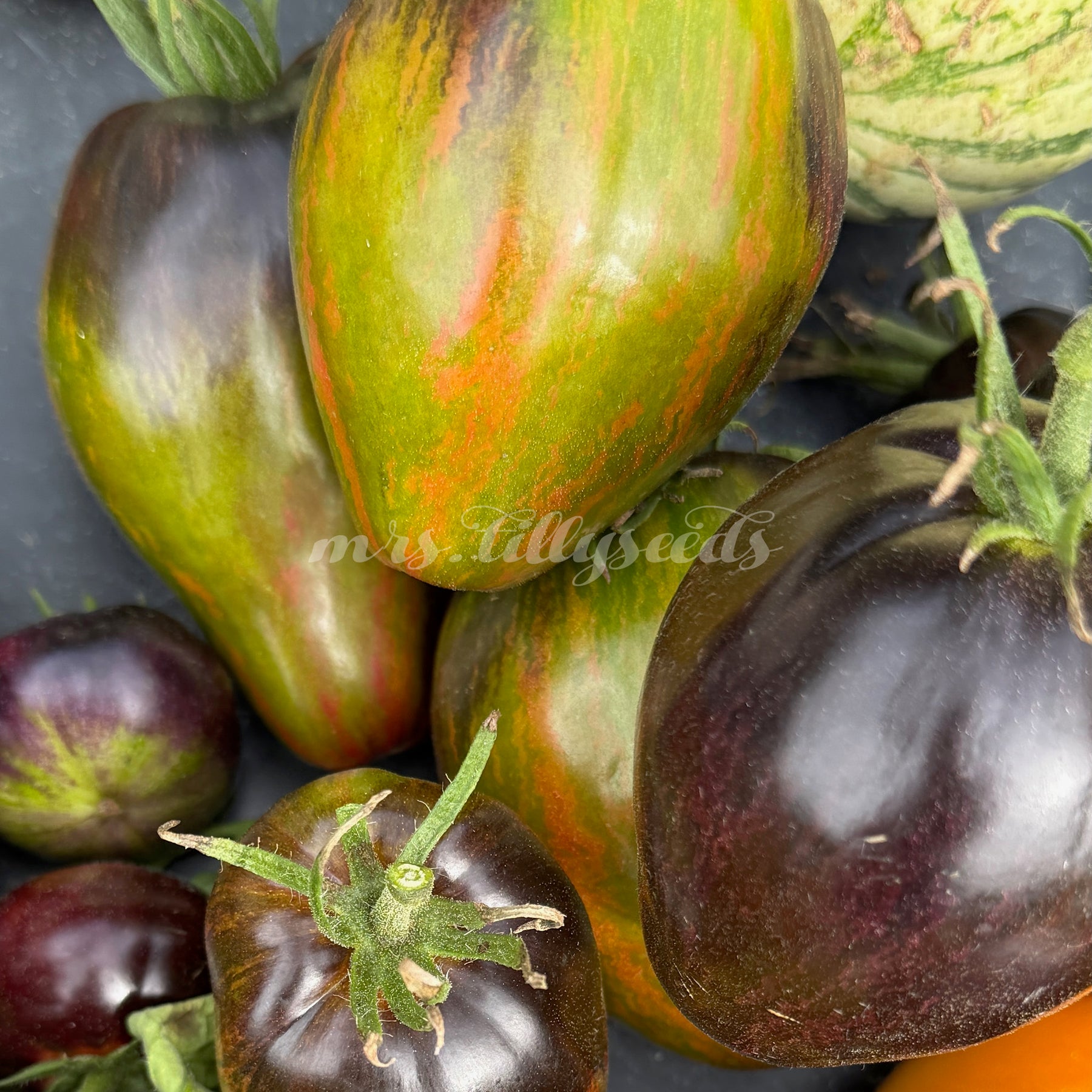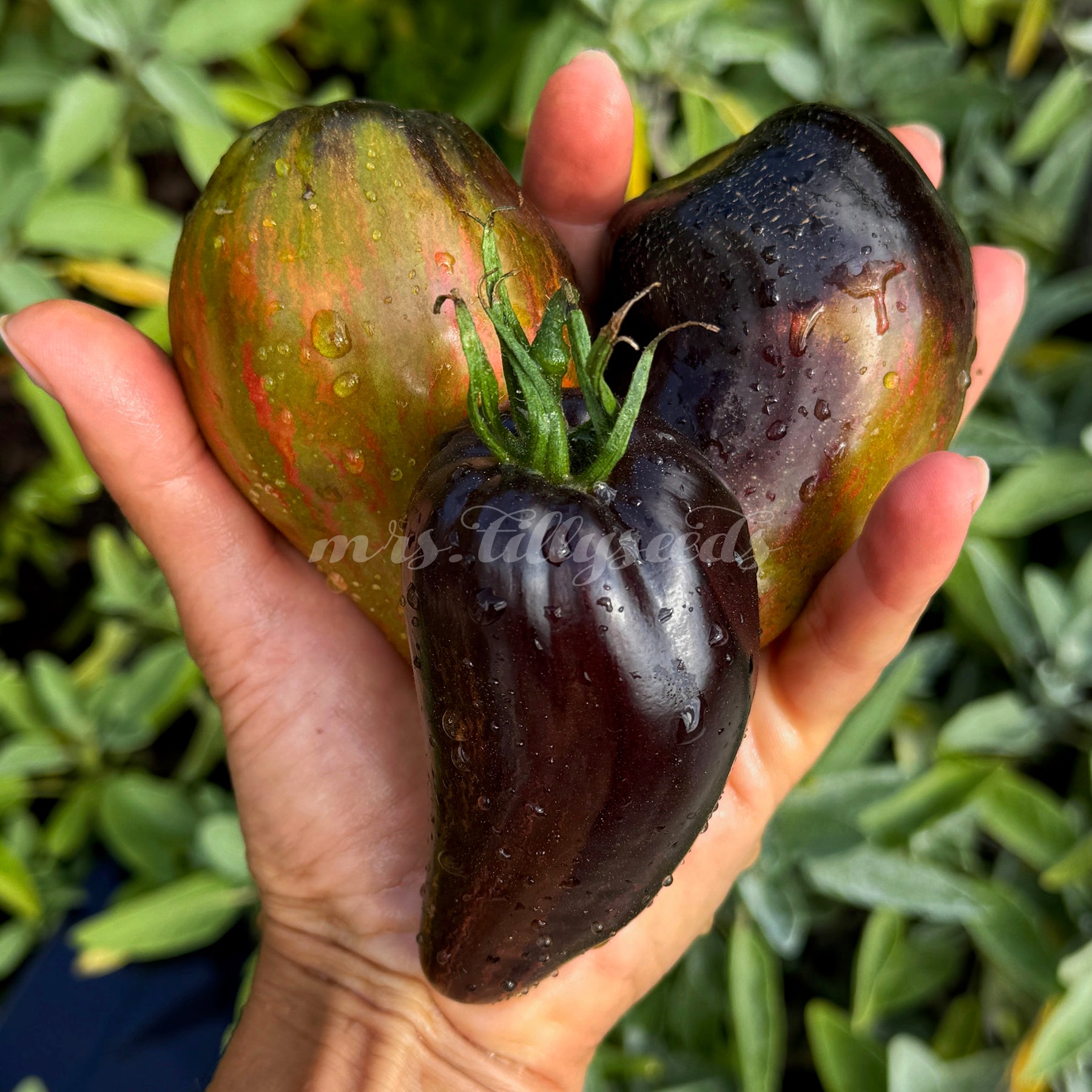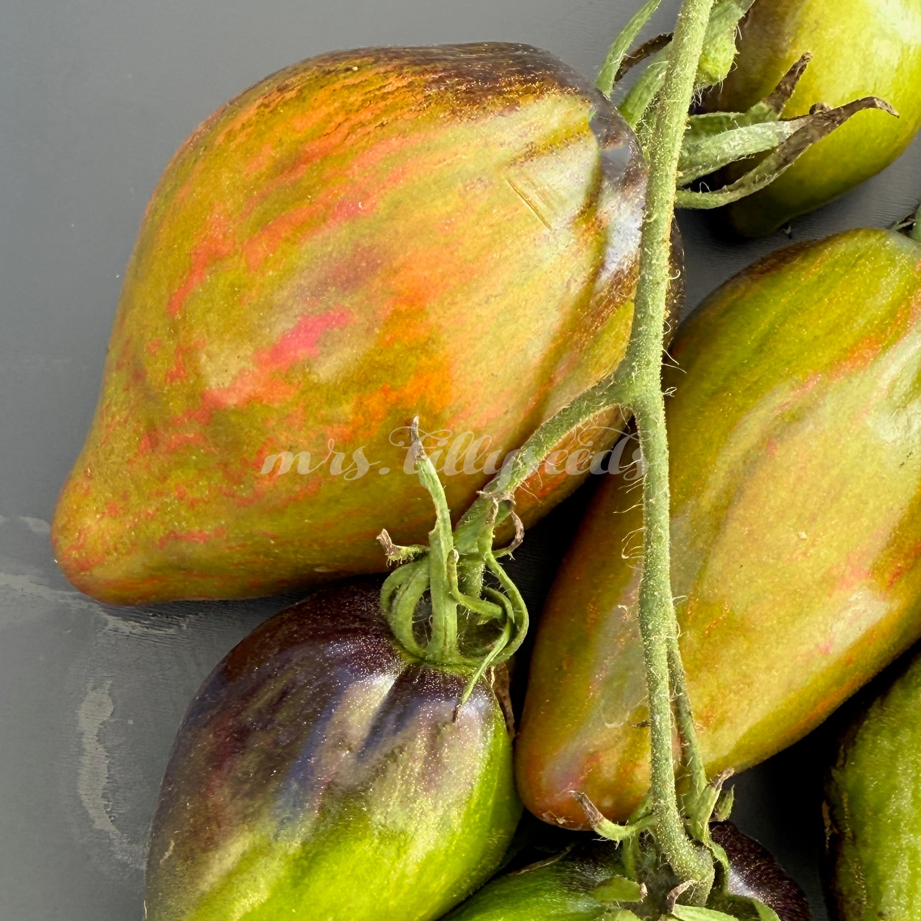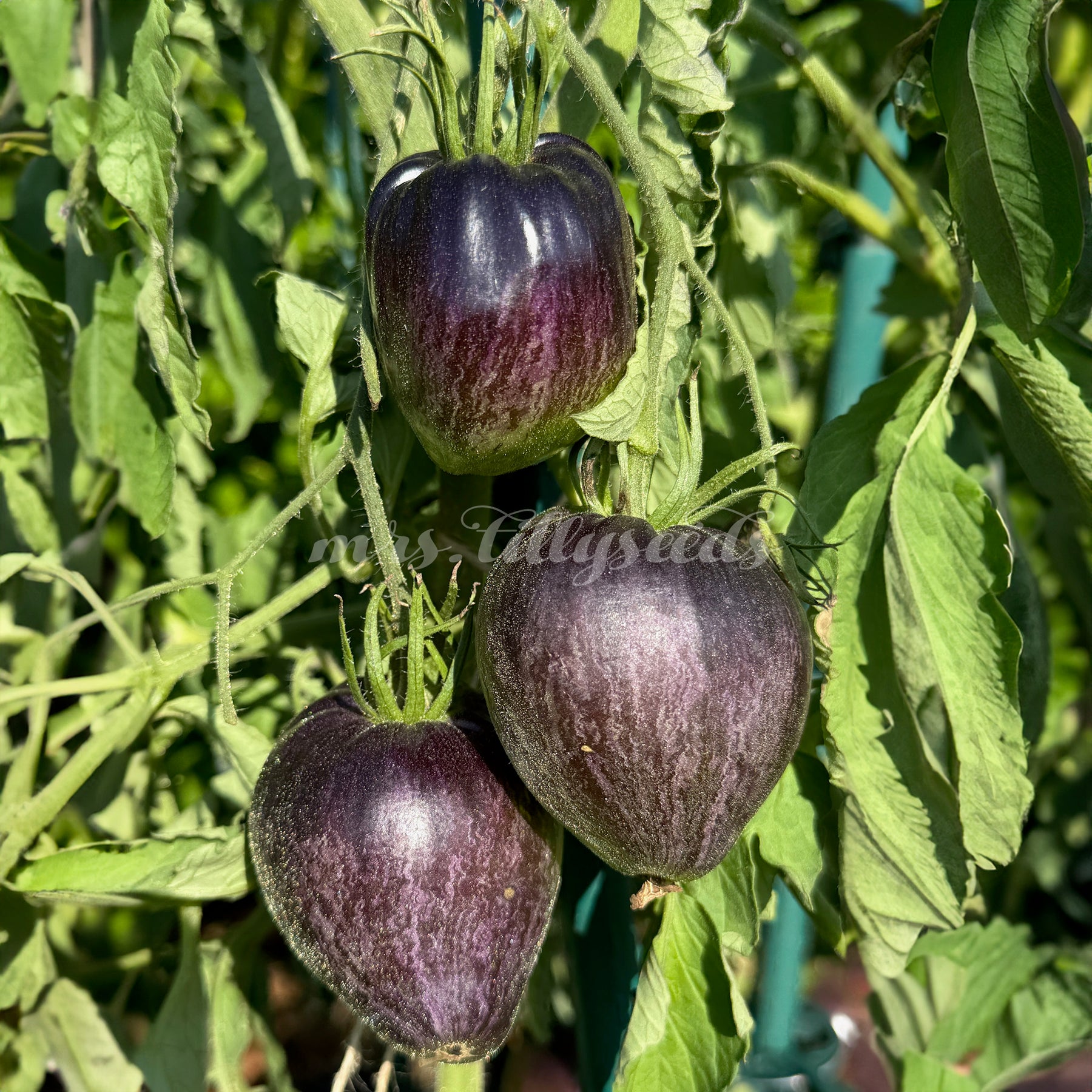 Die Pflanzen wachsen kräftig und erreichen etwa 1,8 Meter Höhe. Sie tragen herzförmige Früchte in wechselnden Formen – manche länglich, andere rundherzförmig, mit einem Gewicht von 200 bis 400 Gramm. Das Farbspiel ist schlicht atemberaubend: ein grün-smaragdener Grundton, der beim Reifen in goldene und karamellfarbene Nuancen übergeht, durchzogen von zarten rosaroten Reflexen.