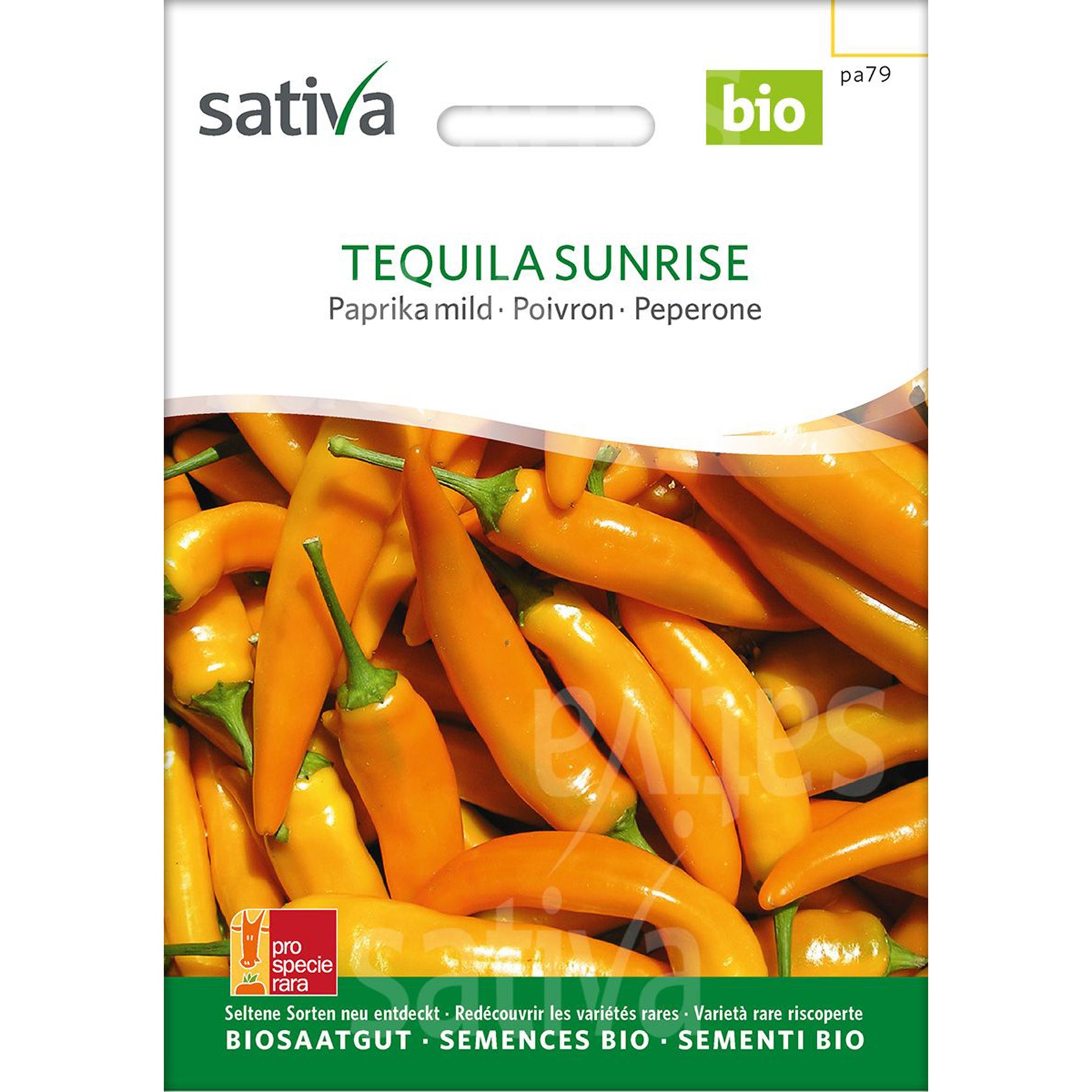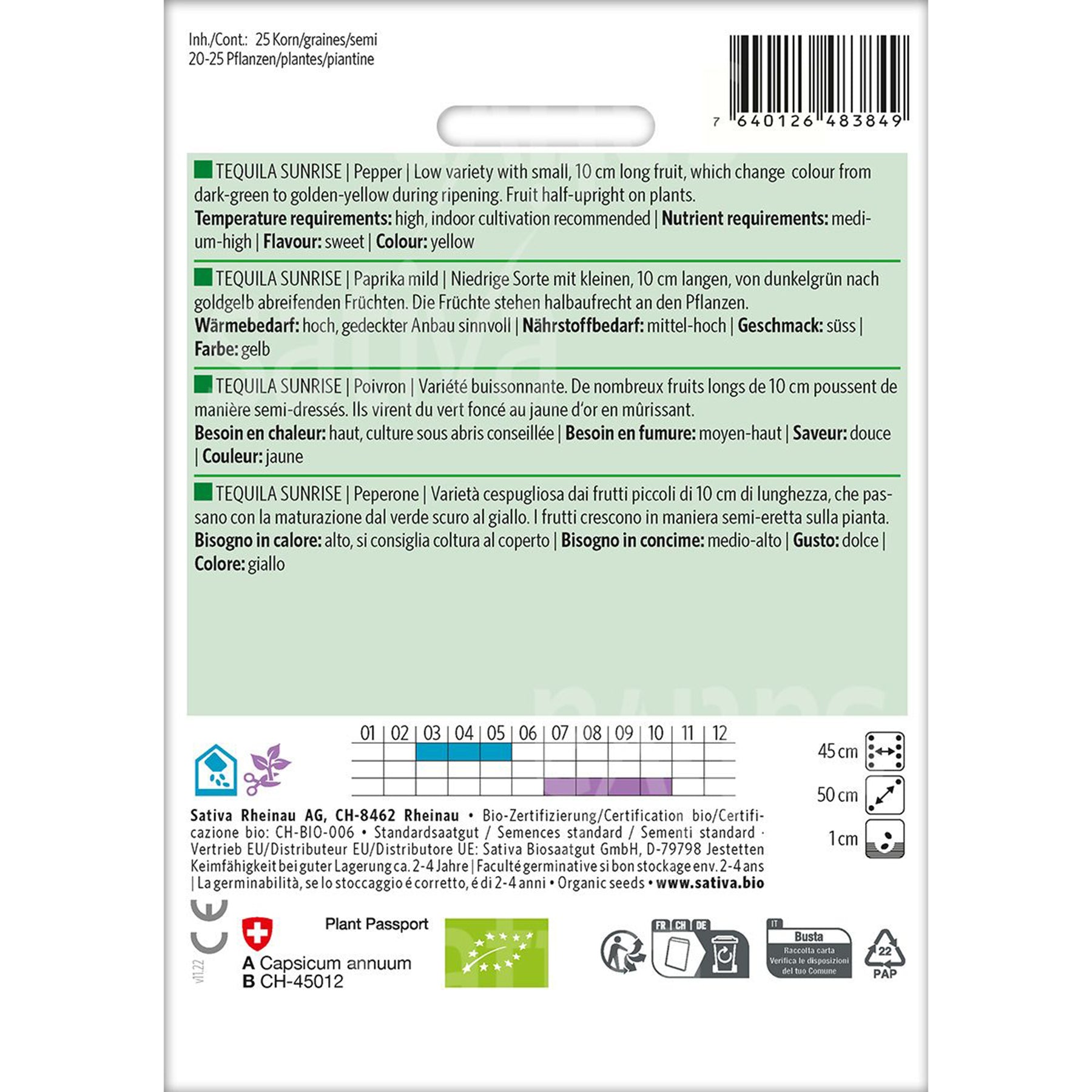 Tequila Sunrise – Paprika mild ist eine niedrig wachsende Sorte mit kompakter Pflanzenstruktur. Sie eignet sich gut für den Anbau in Töpfen, Kübeln oder im geschützten Freiland.