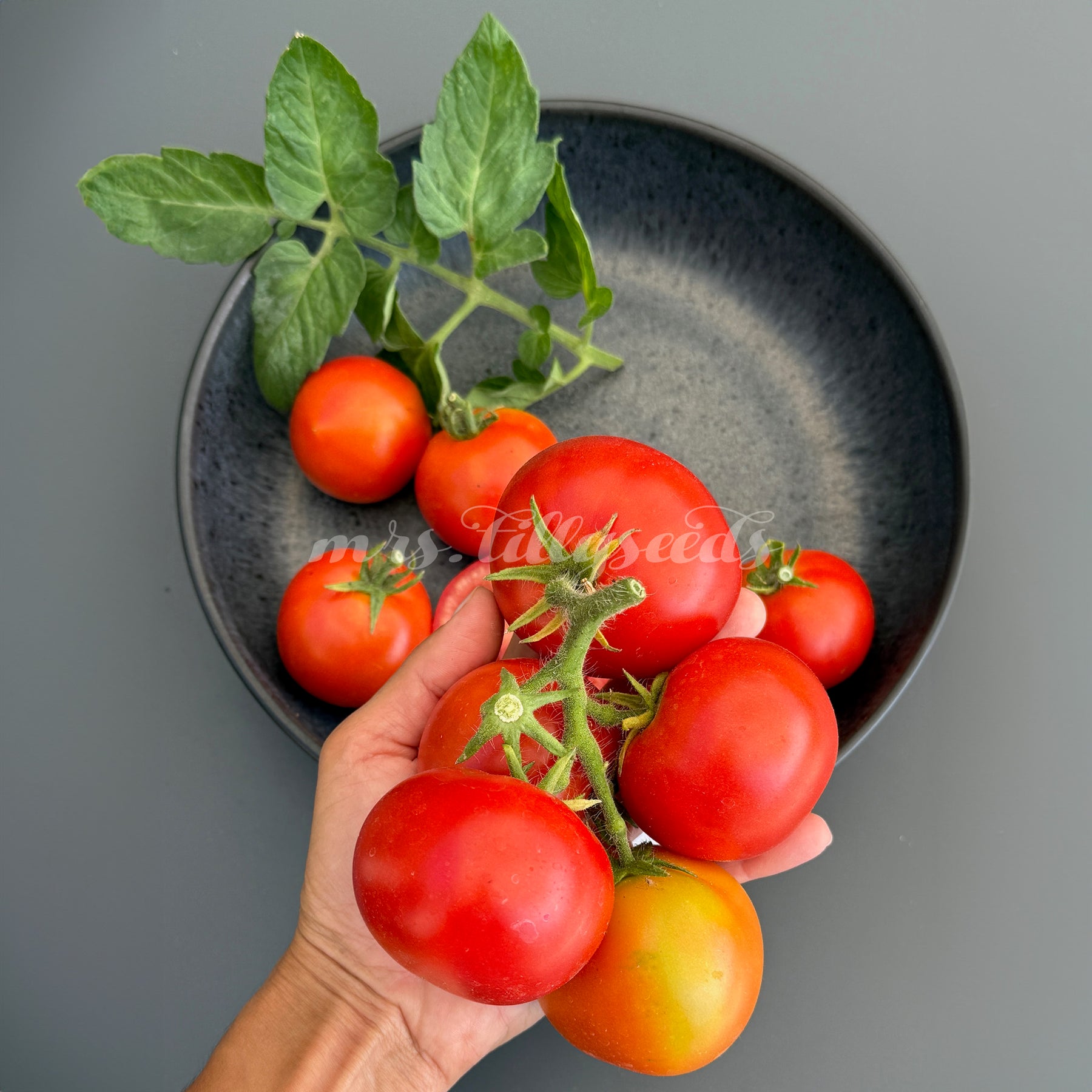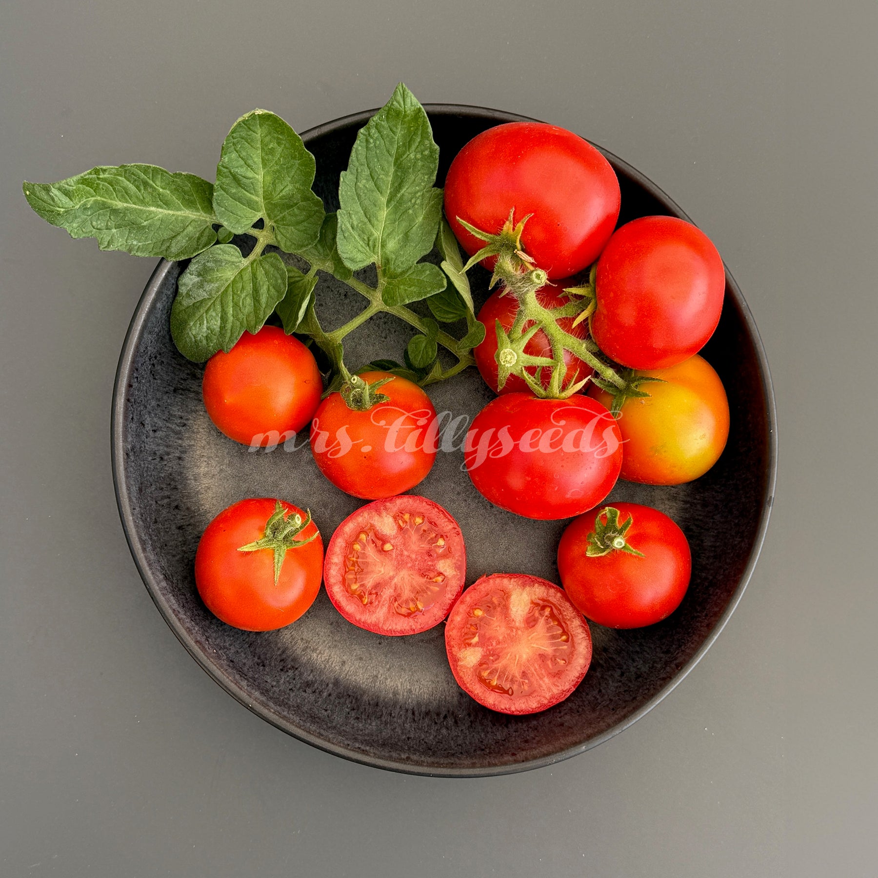 Die Zwergtomate Hoffmanns Rentita ist eine besonders frühtragende, robuste Buschtomate mit beeindruckendem Ertrag auf kleinem Raum. Sie stammt vermutlich aus der Zucht der Samenzucht Hans Hoffmann und wird in vielen Quellen als historische Sorte aus den 1950er-Jahren geführt. Die kompakt wachsende Pflanze bleibt niedrig, bildet dabei jedoch ein dichtes, dunkelgrünes Laubwerk und zahlreiche aromatische, leuchtend rote Früchte.