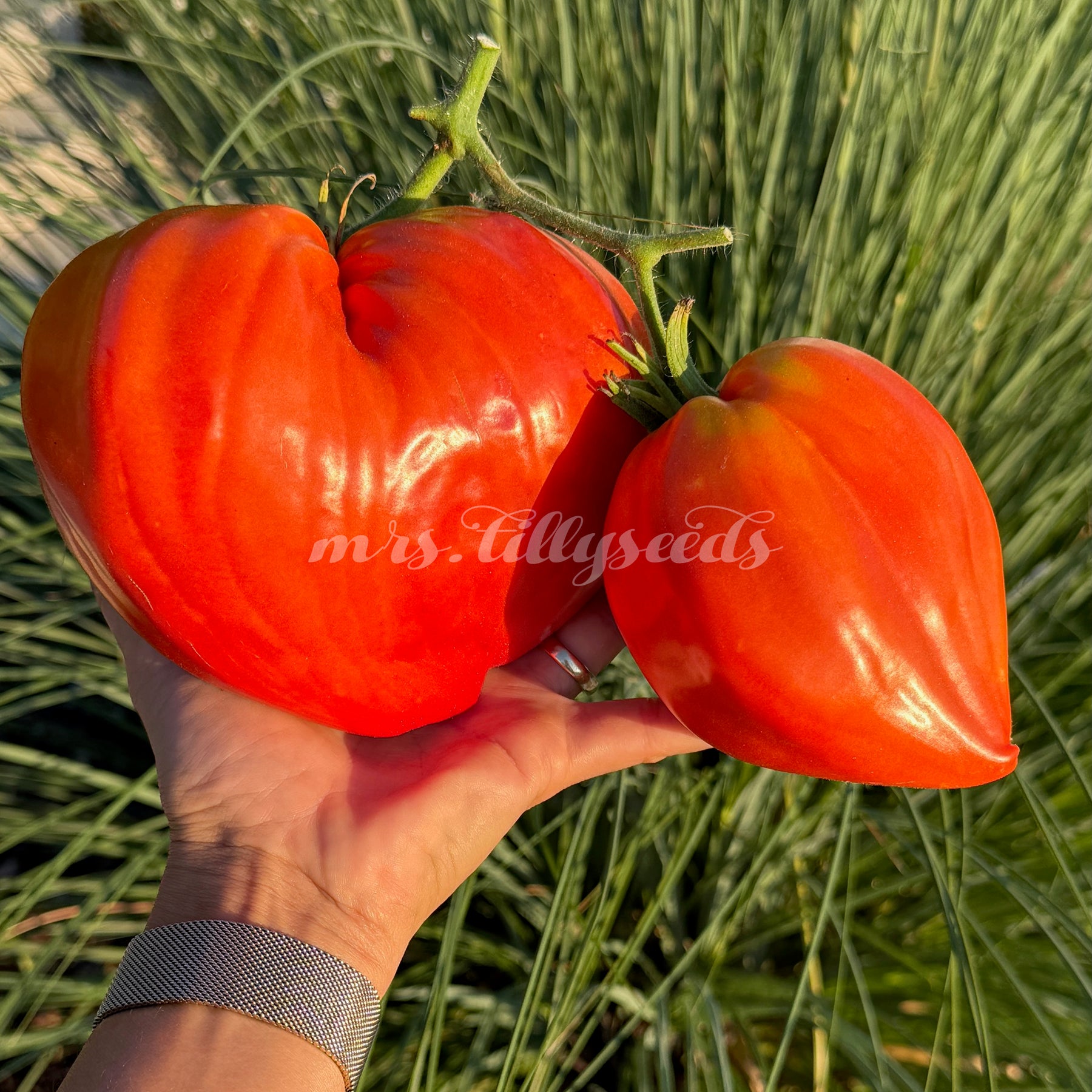 Die Pflanzen wachsen kräftig, hoch und sehr vital, sind für den geschützten Anbau ebenso geeignet wie fürs Freiland (mit Regenschutz empfohlen). Cuore Antico bildet regelmäßige, große Ernten und überrascht oft mit außergewöhnlich großen Früchten. Das große Herz auf dem Foto wog stolze 800 g.
