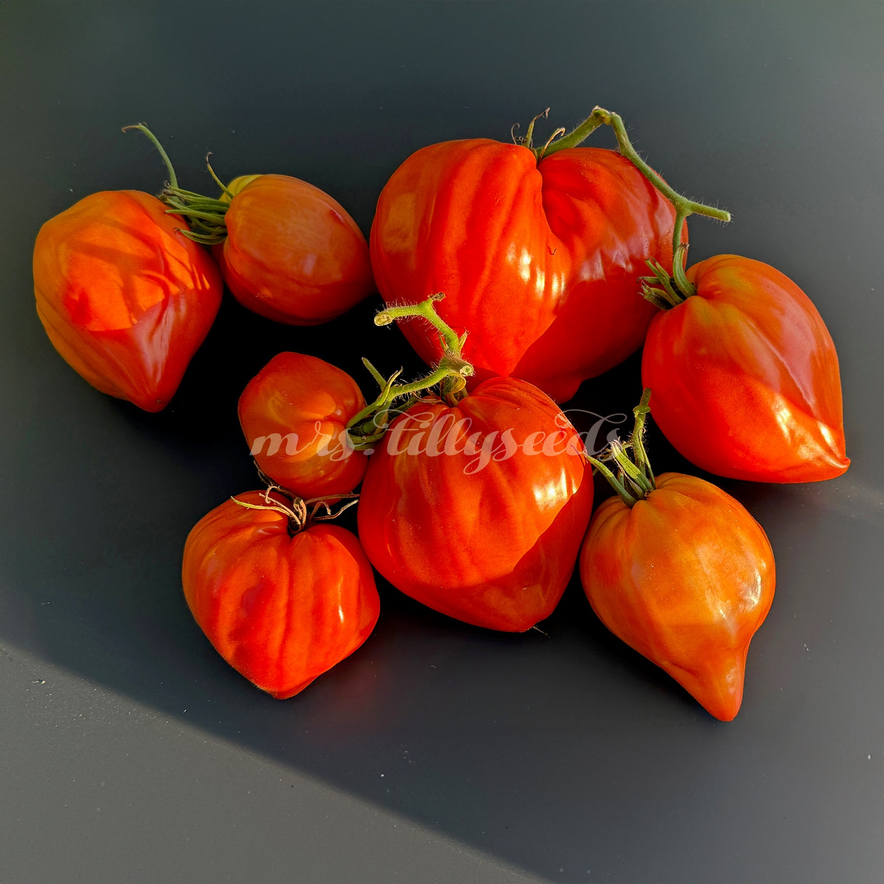 Die Schale leuchtet in warmem Ziegelrot, begleitet von einem samtigen Glanz, der bei Sonneneinstrahlung fast glühend wirkt. Das Fruchtfleisch ist dicht, fleischig und erstaunlich saftig – eine klassische Fleischtomatenstruktur, wie man sie aus alten italienischen Tomatengärten kennt.